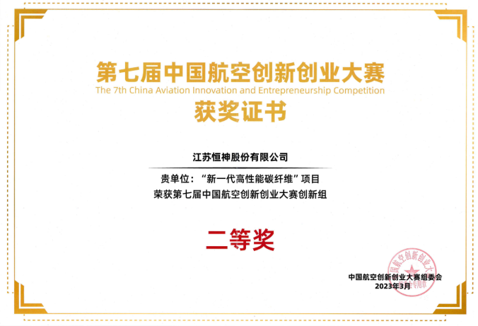 2023年3月16日至17日,第三屆中國航空投資峰會暨第七屆中國航空創新創業大賽全國總決賽在西安落下帷幕。江蘇恒神股份有限公司“新一代高性能碳纖維”項目從第七屆中國航空創新創業大賽全國總決賽中脫穎而出,斬獲“創新組二等獎”佳績。
