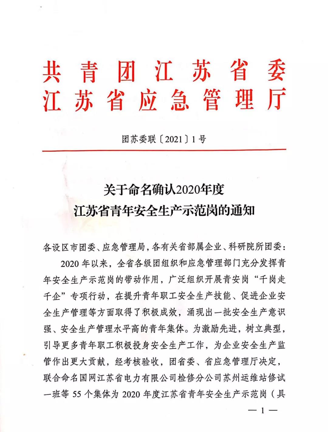 近日,共青團江蘇省委、江蘇省應(yīng)急管理廳公布了獲得“2020年度江蘇省青年安全生產(chǎn)示范崗”榮譽稱號的集體名單,江蘇恒神股份有限公司工務(wù)事業(yè)部動力科獲評“2020年度江蘇省青年安全生產(chǎn)示范崗”。