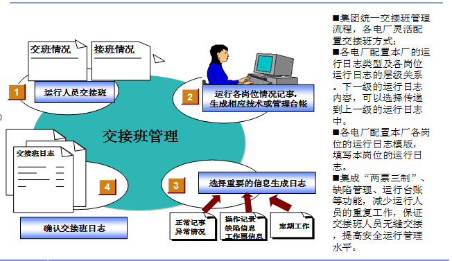 - 集團(tuán)公司統(tǒng)一交接班管理流程,各電廠可配置本廠倒班方式、倒班時(shí)間、運(yùn)行日志類型及各崗位的運(yùn)行日志模版和層級(jí)關(guān)系。下一級(jí)的運(yùn)行日志內(nèi)容,可以選擇提交到上一級(jí)的運(yùn)行日志中。
