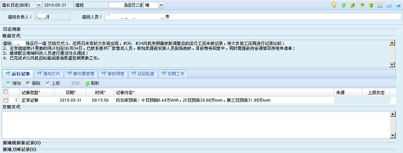交接班管理集成了“兩票三制”、工器具交接、運(yùn)行日志及缺陷管理等功能。交接班管理可自動(dòng)關(guān)聯(lián)與運(yùn)行相關(guān)的工作內(nèi)容,減少運(yùn)行人員的重復(fù)工作,保證交接班人員無縫交接,提高安全運(yùn)行管理水平。