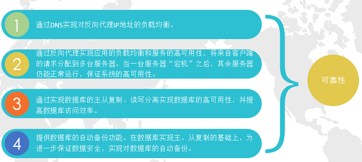 系統(tǒng)通過DNS實現(xiàn)對反向代理IP地址的負(fù)載均衡,通過反向代理實現(xiàn)應(yīng)用負(fù)載均衡,通過數(shù)據(jù)庫主從復(fù)制實現(xiàn)數(shù)據(jù)庫高可用性,通過嚴(yán)格的質(zhì)量管理體系控制軟件質(zhì)量,實現(xiàn)了系統(tǒng)整體的高可靠性。
